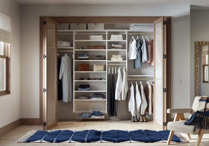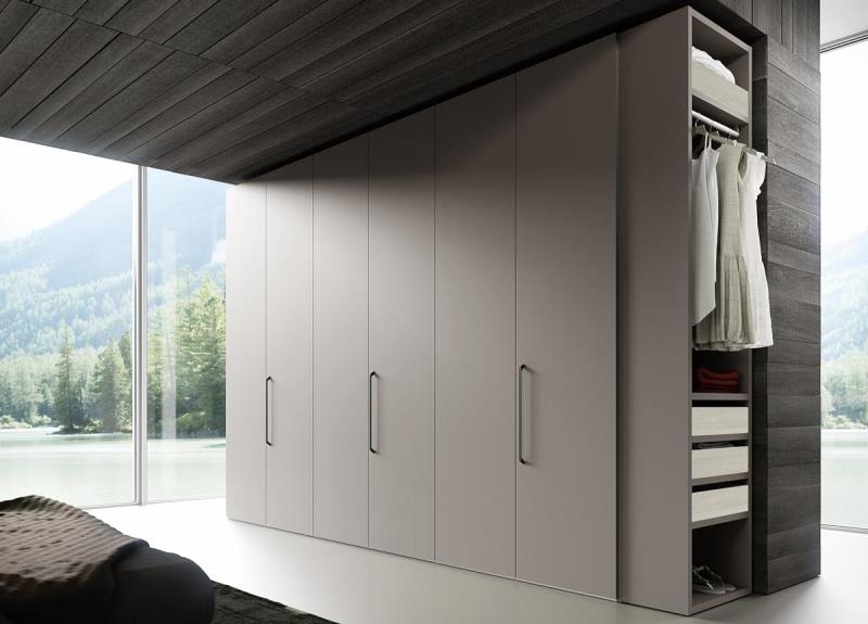 کمد مدرن با خطوط صاف، دستگیرههای مخفی یا حذف کامل دستگیره (پوشباتون)، و استفاده از متریالهایی مانند MDF با روکشهای براق (هایگلاس) یا مات ساده.